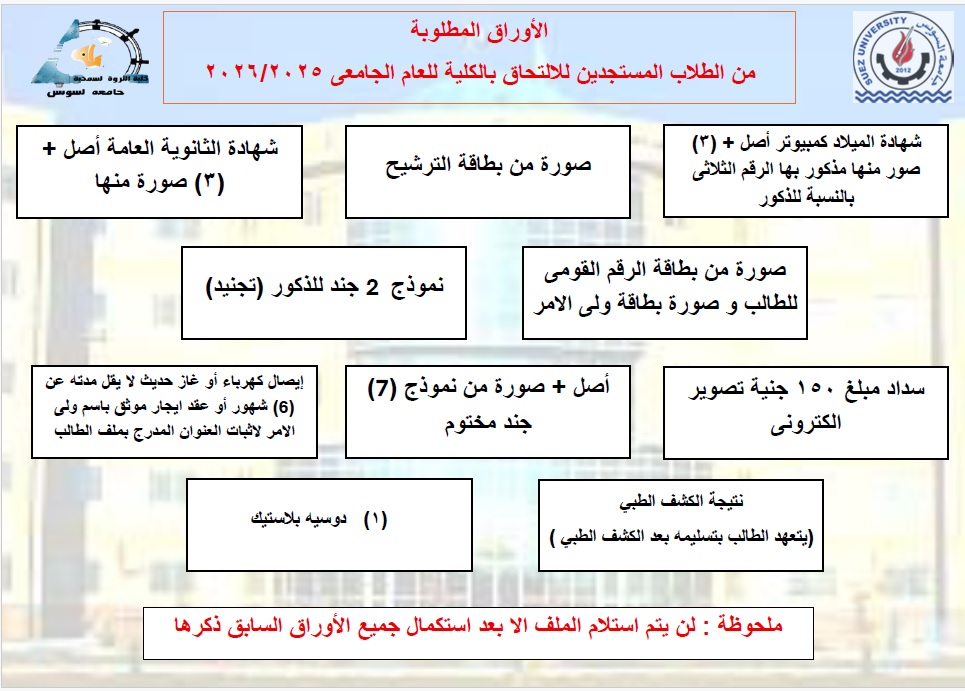 الاوراق المطلوبة من الطلاب المستجدين للالتحاق بالكلية للعام الجامعى 2025-2026