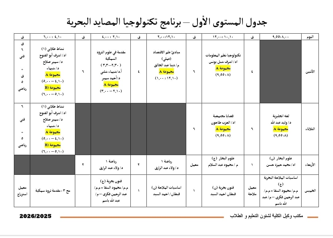 جدول المحاضرات النظرية والدروس العملية لطلاب المستوى الأول (برنامج تكنولوجيا المصايد البحرية)، الفصل الدراسي الأول للعام الجامعي 2025-2026