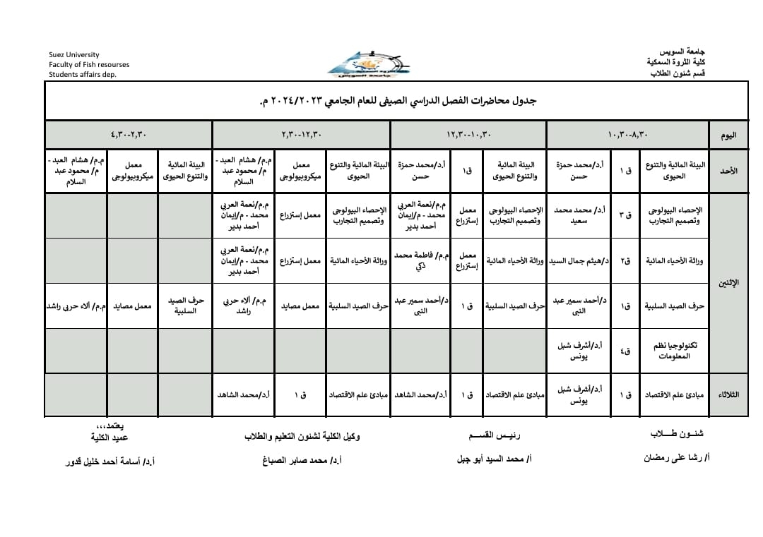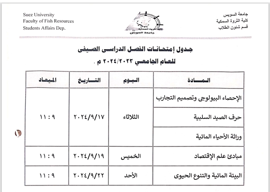 جدول امتحانات الدرسات العليا كلية الثروة السمكية الفصل الدراسى الاول العام الجامعى 2023-2024
