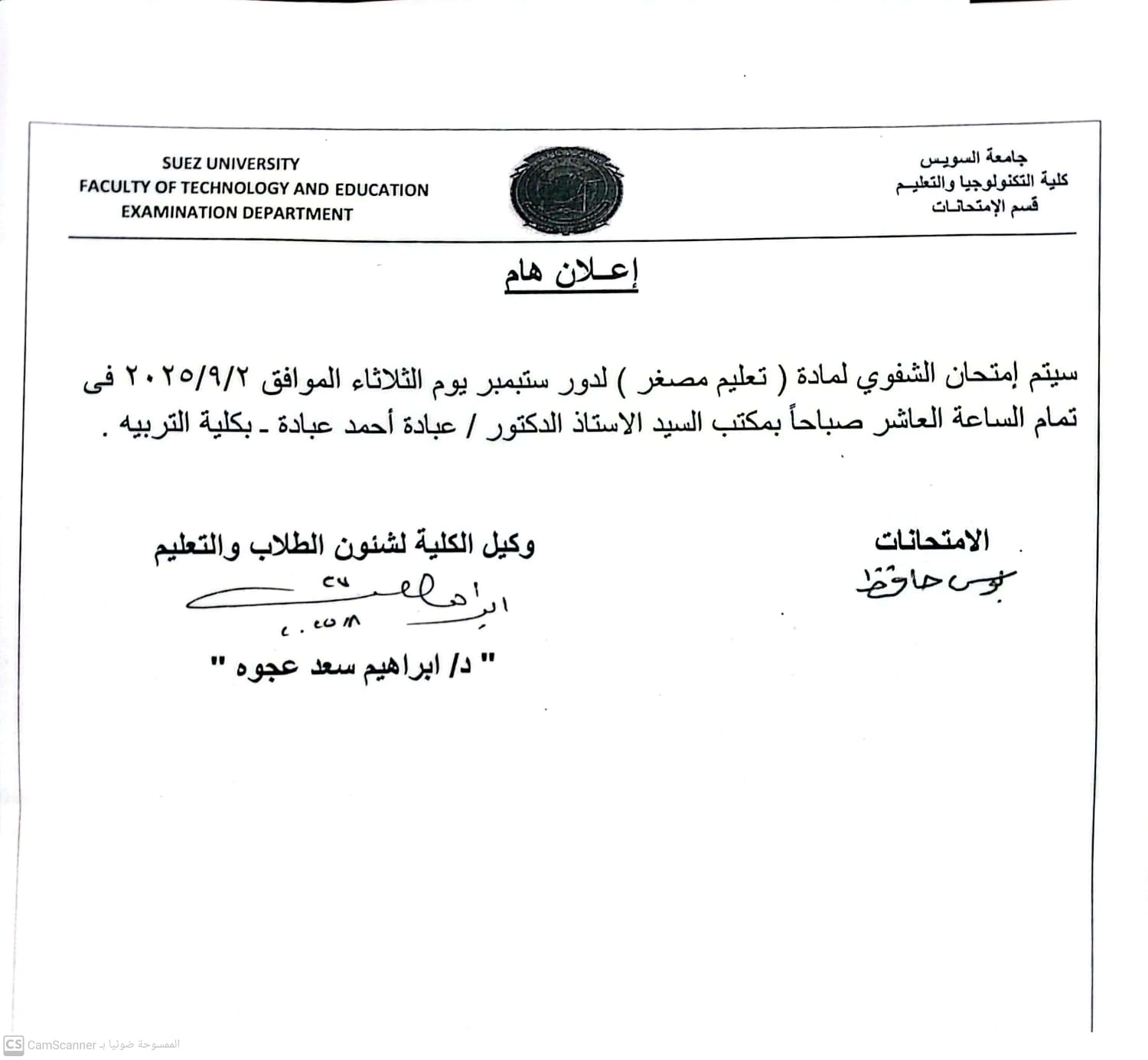 سيتم إمتحان الشفوي لمادة ( تعليم مصغر ) لدور ستبمبر يوم الثلاثاء الموافق ٥/٩/٢ ٢٠٢ فى تمام الساعة العاشر صباحاً بمكتب السيد الاستاذ الدكتور / عبادة أحمد عبادة - بكلية التربيه.