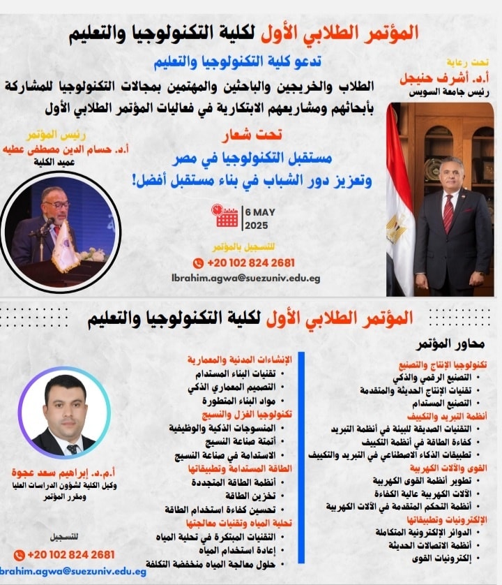 تسعى كلية التكنولوجيا والتعليم بالسويس لتقديم خدمة تعليمية متميزة فى تخصصات الميكانيكا (شعبة إنتاج وشعبة تبريد)، الكهرباء (شعبة القوى الكهربية وشعبة الإلكترونيات)، والإنشاءات المدنية والمعمارية والغزل والنسيج وذلك عن طريق تخريج كوادر قادرة على المنافسة فى سوق العمل المحلى والاقليمى، وإلى جانب الخدمات التعليمية المتميزة الى تقدمها الكلية تضع إدارة الكلية النشاط الطلابى كهدف أساسى وتربوى لتنمية المهارات البشرية للطلاب من خلال مجموعة الأنشطة المختلفة على مستوى الكلية والجامعة. ومواكبة لمتطلبات سوق العمل فقد تم إدخال برامج تكنولوجية إلى أقسام الكلية ومن المنتظر تفعيل برامج مثل تكنولوجيا الطاقة الجديدة والمتجددة وتكنولوجيا الإنشاءات المدنية بجانب برامج التعليم الصناعى. وإلى جانب إهتمام الكلية بالآداء المتميز لخريجيها فإنها تعد بيت خبرة لخدمة المجتمع وتنمية البيئة وذلك من خلال مركز الخدمة للإستشارات التكنولوجية والبحوث والتدريب (وحدة ذات طابع خاص) وذلك للنهوض بمجتمعنا ووطننا كما أتمنى لأبنائى الطلاب النجاح والتفوق.